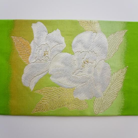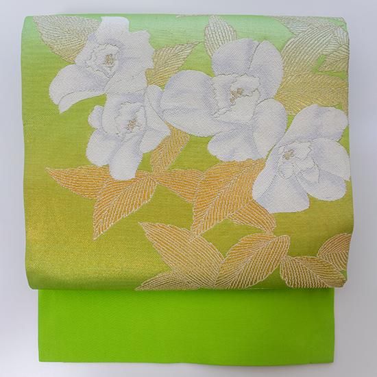 名古屋帯 黄緑色 牡丹柄 正絹 Aランク